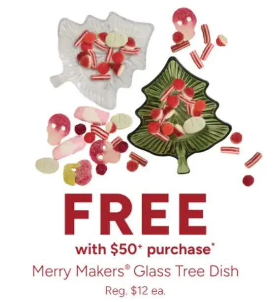 Don't miss out! Shop in store and get Merry Makers glass tree dish free with $50 purchase.