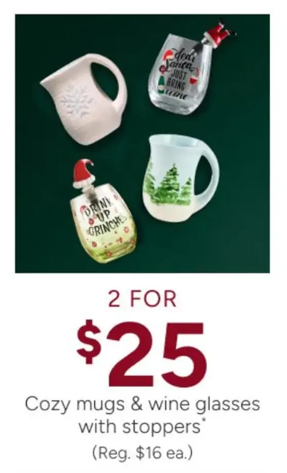 Don't miss this! Shop in store and get 2 for $25 cozy mugs and wine glasses with stoppers.